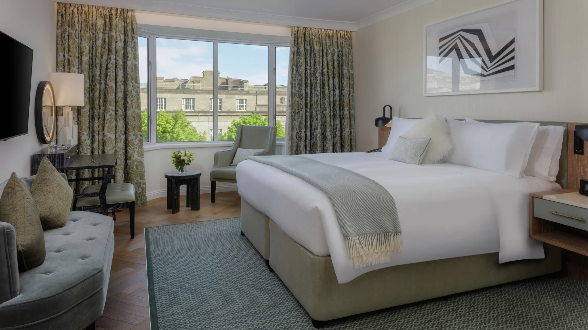 The hotel features bright, spacious rooms with sleek wood floors, Irish-inspired décor, large bay windows, and marble bathrooms, creating a harmonious blend of modern charm and local heritage.