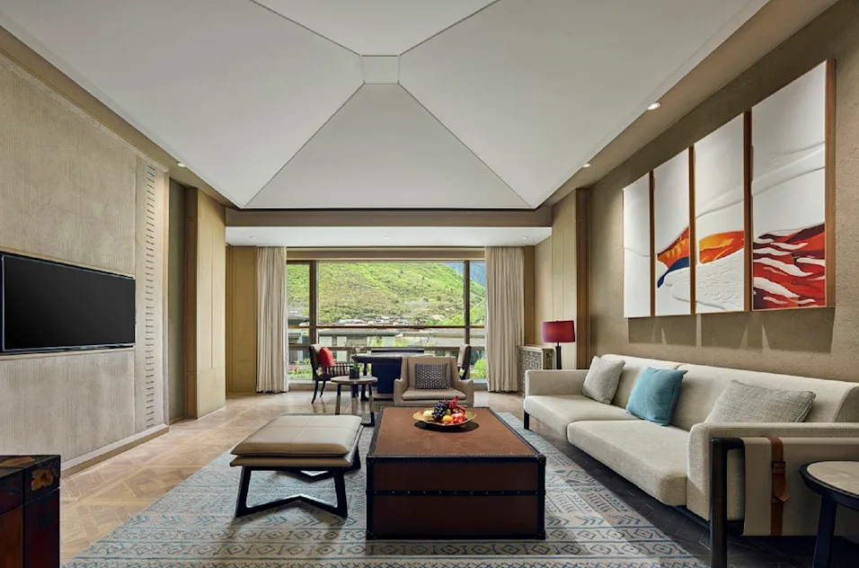 The resort offers spacious rooms and villas featuring Tibetan-inspired décor with textured wood elements and original artwork, many with expansive balconies or terraces showcasing breathtaking mountain views.
