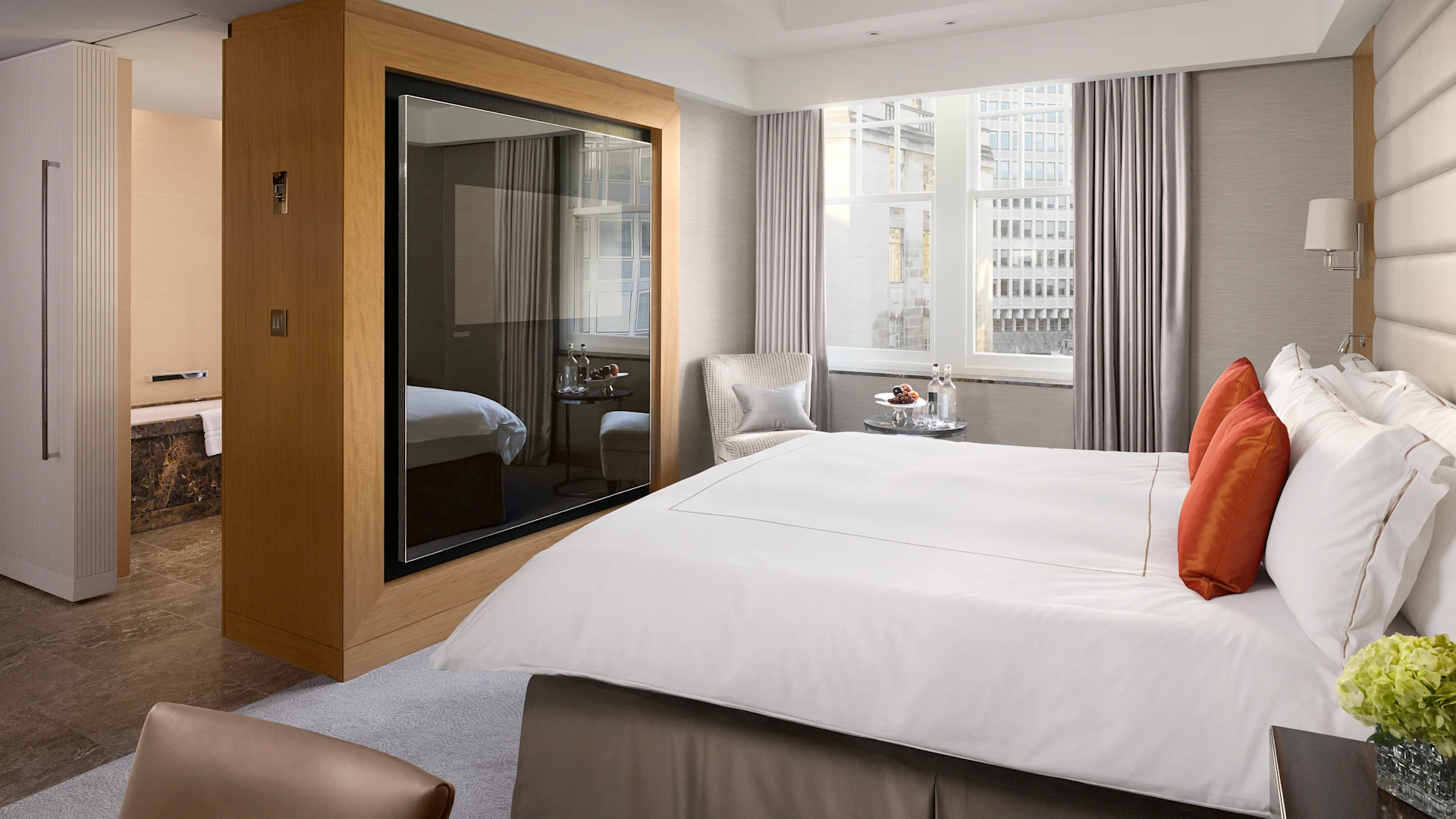 The hotel’s interiors feature a contemporary British aesthetic with midcentury influences, showcasing bespoke artwork, marble bathrooms, spacious layouts, and modern amenities such as Nespresso machines, large HDTVs, and rain showers.