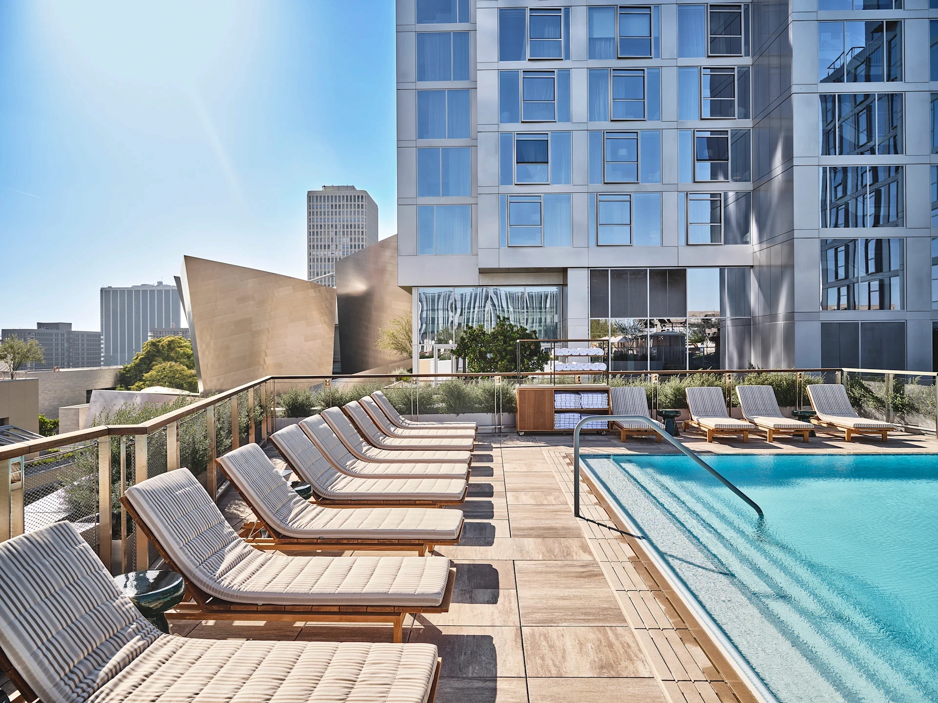 The 25-story hotel features 305 sleek rooms and suites with floor-to-ceiling windows offering stunning views of the concert hall and downtown skyline, blending contemporary design with luxurious comfort.