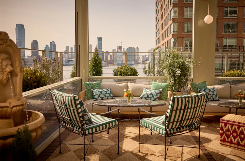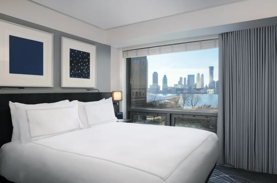 The hotel features expansive suites averaging over 430 square feet, with separate living and sleeping areas, modern furnishings, and spa-inspired bathrooms equipped with Byredo toiletries and waterfall rain showers. Floor-to-ceiling windows flood rooms with natural light and frameiconic city and river views
