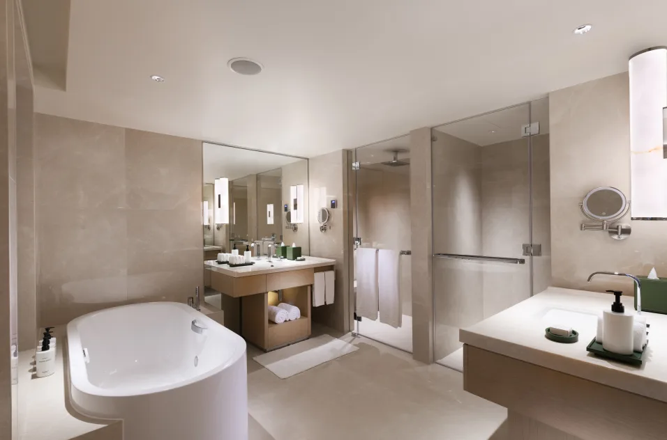 Guests enjoy a diverse culinary journey with multiple restaurants offering international, Italian, and Cantonese cuisines, alongside a chic Lobby Lounge for afternoon tea and evening cocktails. The hotel’s outdoor pool, with lush surroundings, is perfect for relaxation.