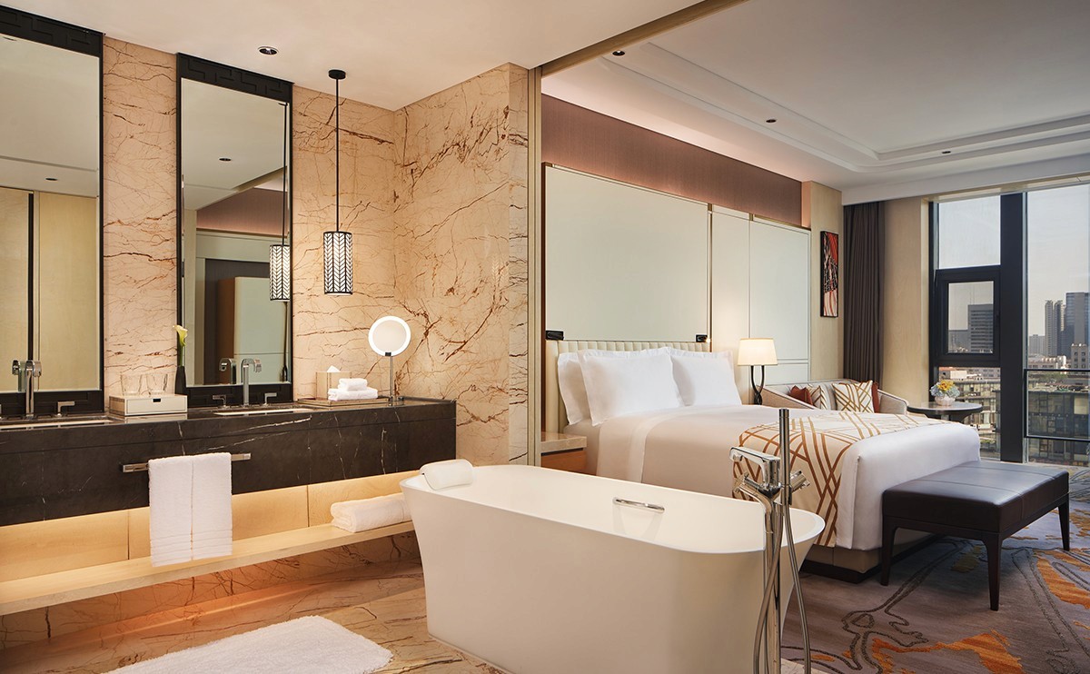 The 272 rooms and suites are elegantly designed with floor-to-ceiling windows showcasing panoramic city or river views. Modern amenities include luxurious marble bathrooms, plush bedding, Nespresso machines, and smart controls for lighting and temperature.