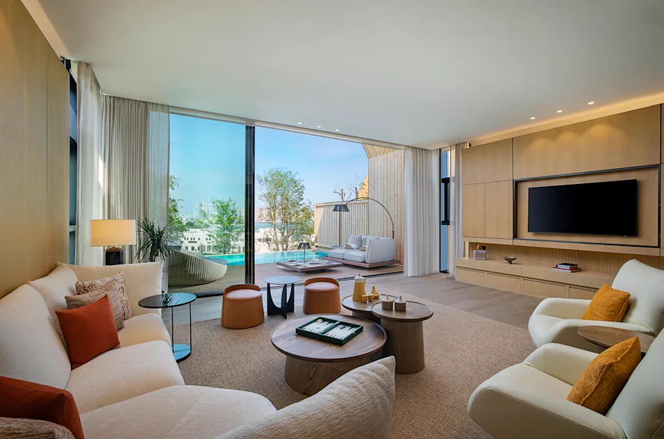 The resort features spacious private villas each with its own swimming pool, personal butler service, and concierge, providing guests with utmost privacy and comfort in a culturally rich setting. The villas come equipped with modern comforts such as air conditioning, flat-screen TVs, coffee/tea makers, minibars, and soundproofed rooms, ensuring a relaxing stay.
