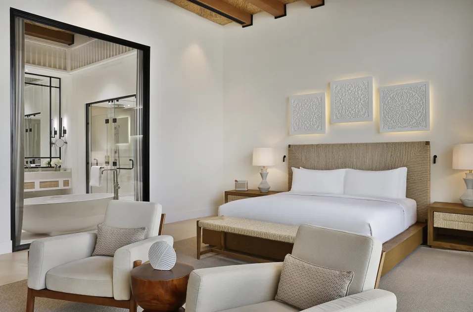 Maysan Doha features 32 elegant suites and villas, each equipped with private pools, modern amenities like a minibar, air conditioning, flat-screen TVs, and coffee/tea makers, combining luxury with comfort.