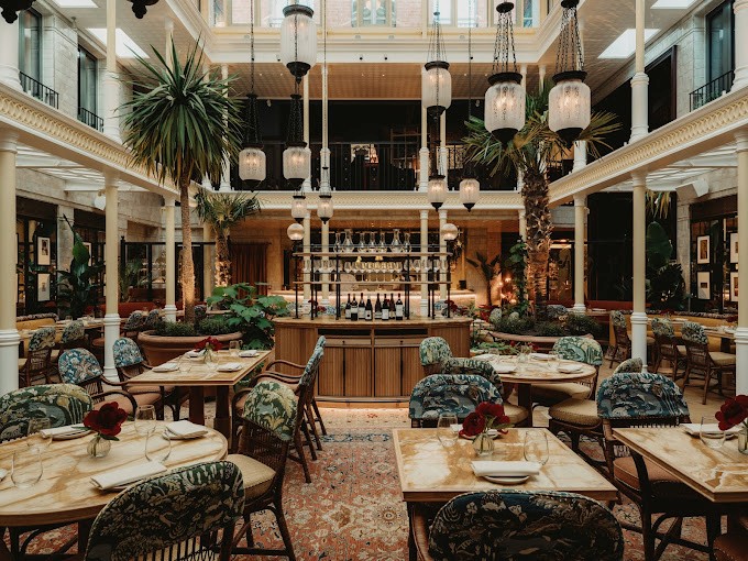 Guests can savor innovative cocktails at three stylish bars and enjoy cuisine in the main restaurant, which includes intimate dining areas with opulent booths and fireplaces. The hotel also offers a 24-hour fitness center, a spa with massage treatments, a well-curated library, and 24-hour room service.