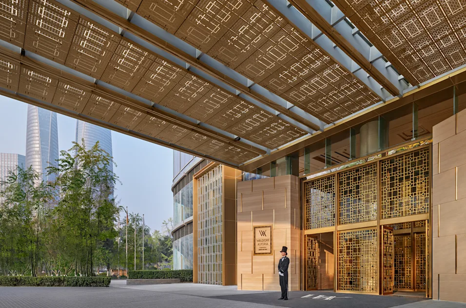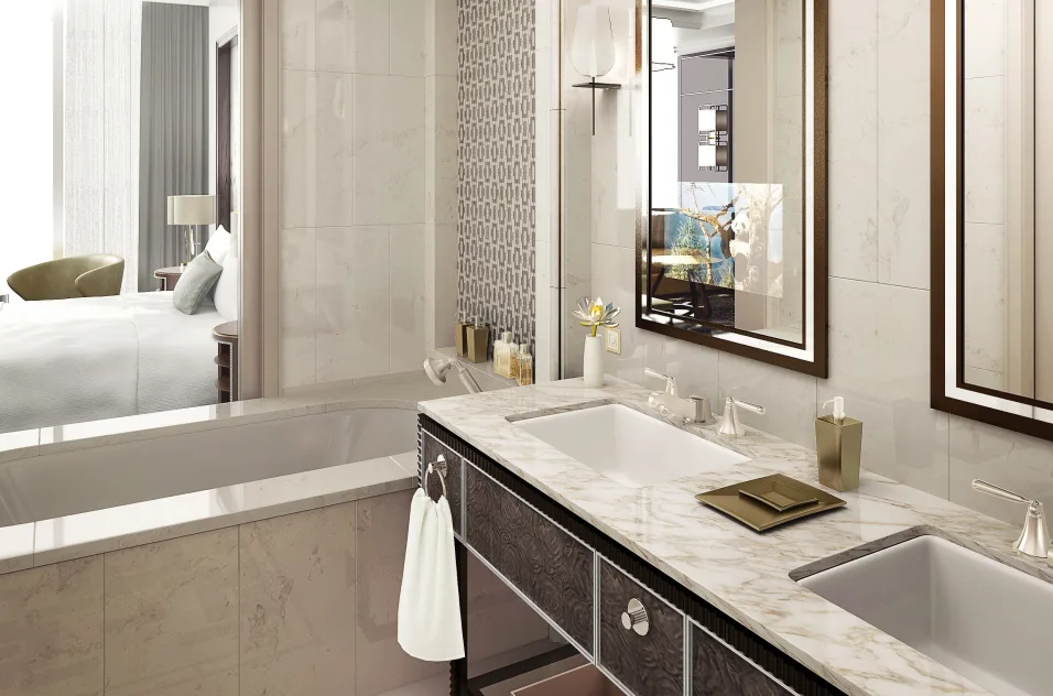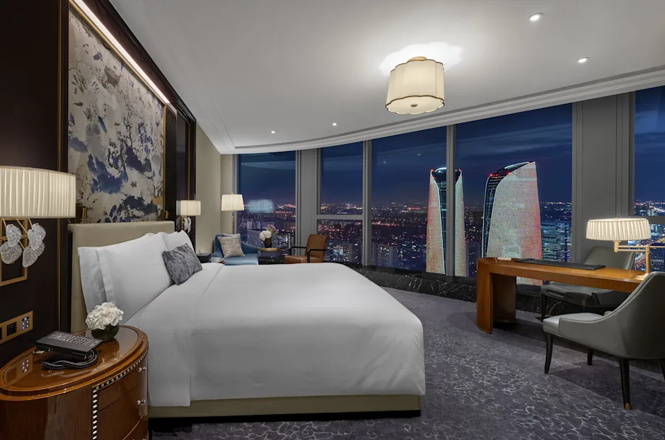 The hotel features 289 spacious rooms and suites, appointed with lavish bedding, walk-in closets, modern workspaces, and marble bathrooms with soaking tubs and double vanities. Many rooms offer panoramic views of the cityscape.