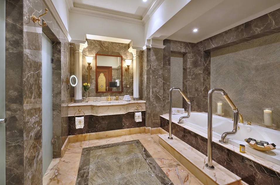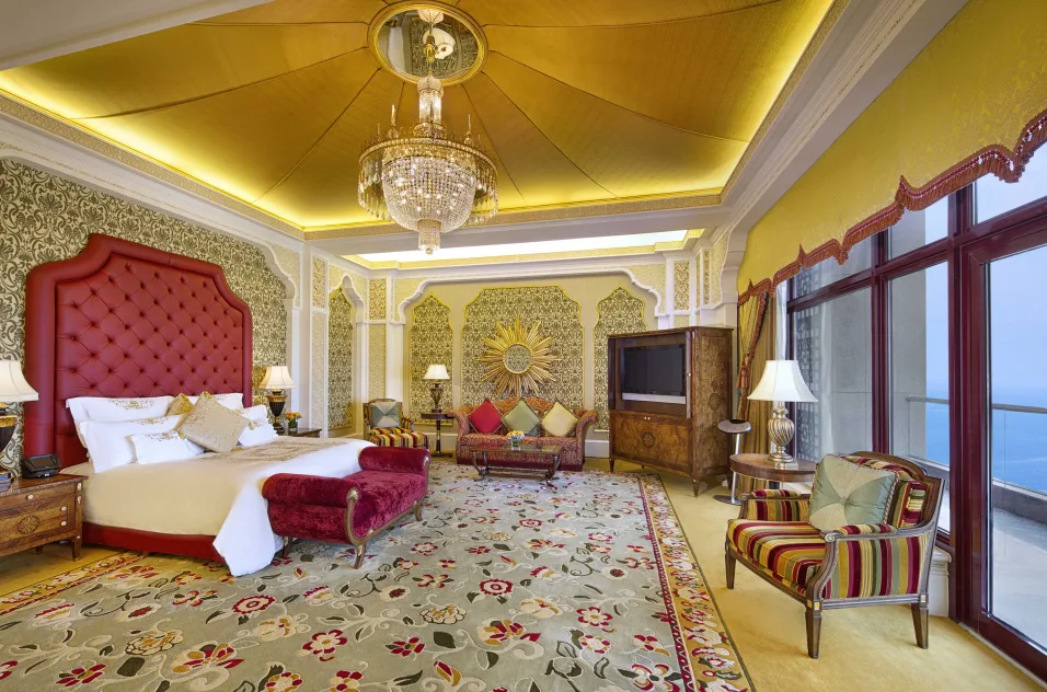 The hotel features 46 exclusive rooms, suites, and residences, each with Arabic-inspired décor,.gold accents, intricate patterns, and modern amenities. Spacious and ornate, they blend traditional opulence with contemporary comforts, offering stunning sea or city views.