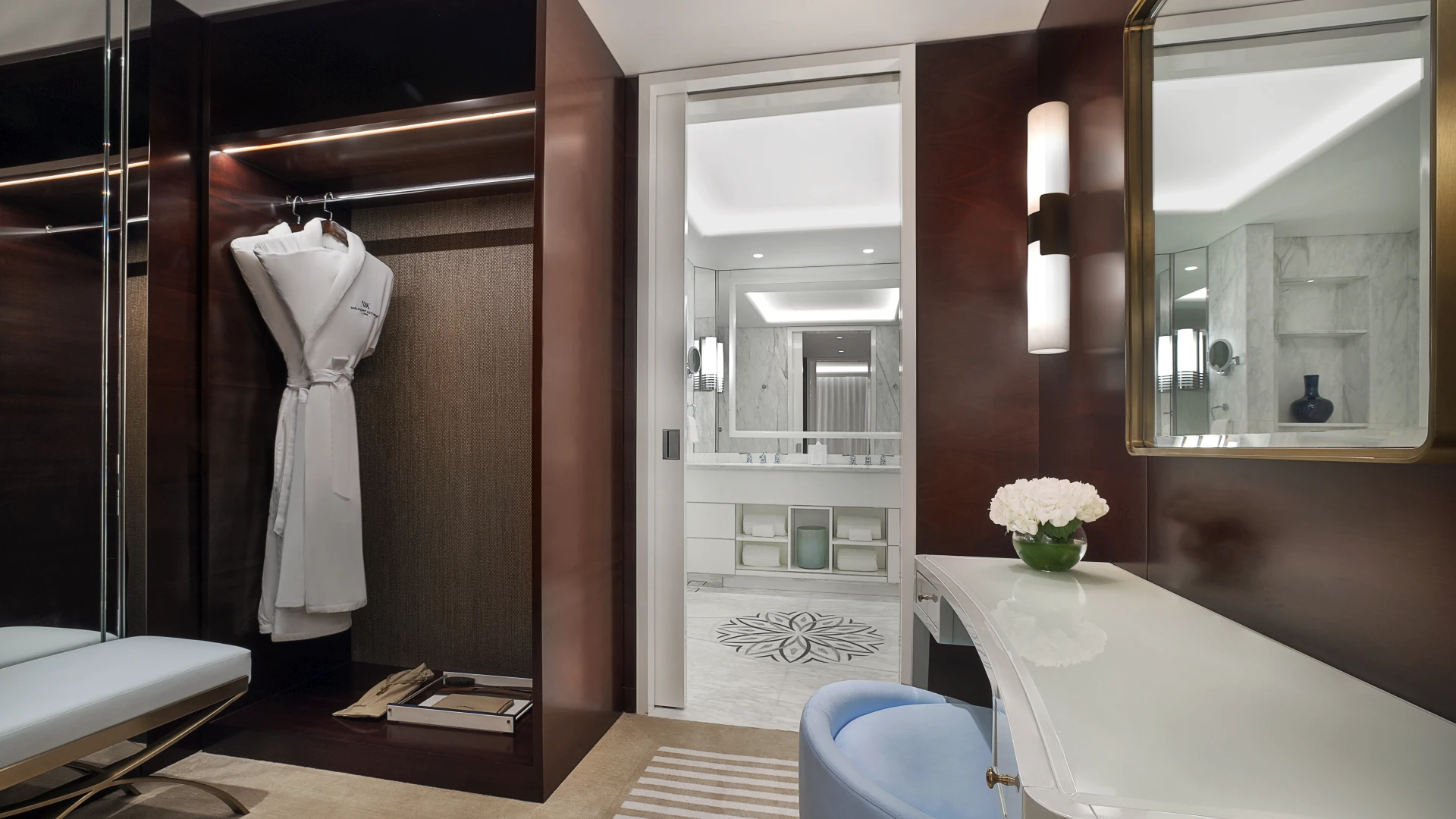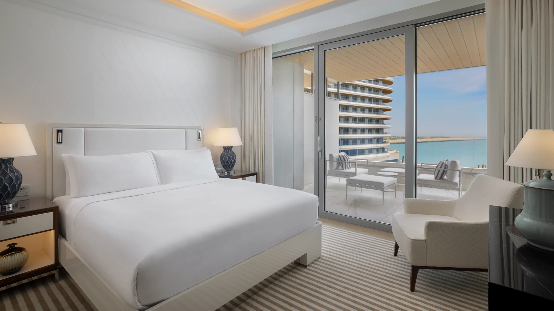 Guest rooms and suites feature floor-to-ceiling windows, furnished private balconies, marble bathrooms, premium bedding, and soundproofing, with many units overlooking the sea or private beach.