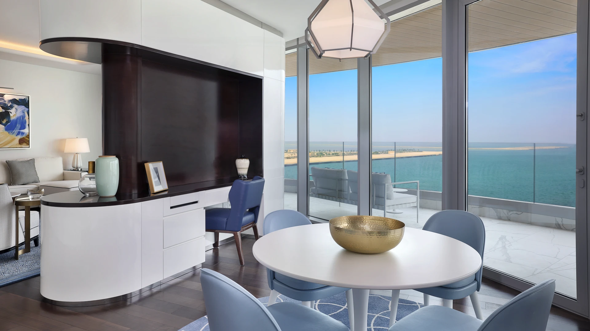Home to the only ESPA Life Spa in the Middle East, the resort offers a comprehensive spa and wellness center with treatment rooms, sauna, Turkish bath, hydrotherapy, body scrubs, wraps, and a full menu of massages and facials. Outdoor facilities include three pools plus a children’s pool, a private beach with cabanas and sun loungers, a surf pool and waterpark, water sports, tennis and padel courts, and a 24-hour gym with yoga and Pilates classes and personal trainers.