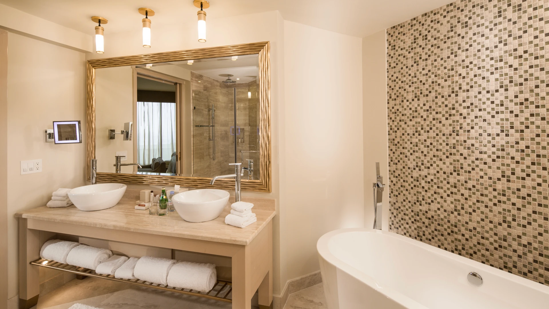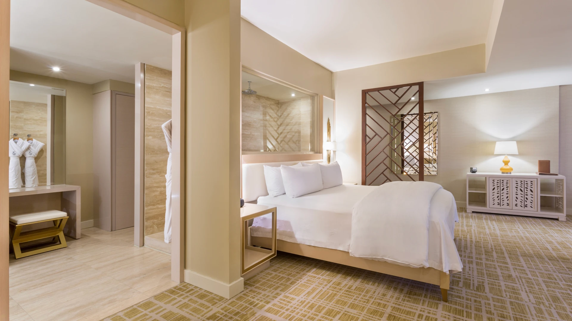 The hotel features spacious rooms and suites starting at 344 sq ft, with city or ocean views, fine linens, Nespresso machines, stocked minibars, workspaces, and bright marble bathrooms with Sodashi amenities, vanities, and walk-in rain showers. Options include deluxe kings/doubles, junior suites, condo suites with living areas and kitchens, and studio suites for extended stays.