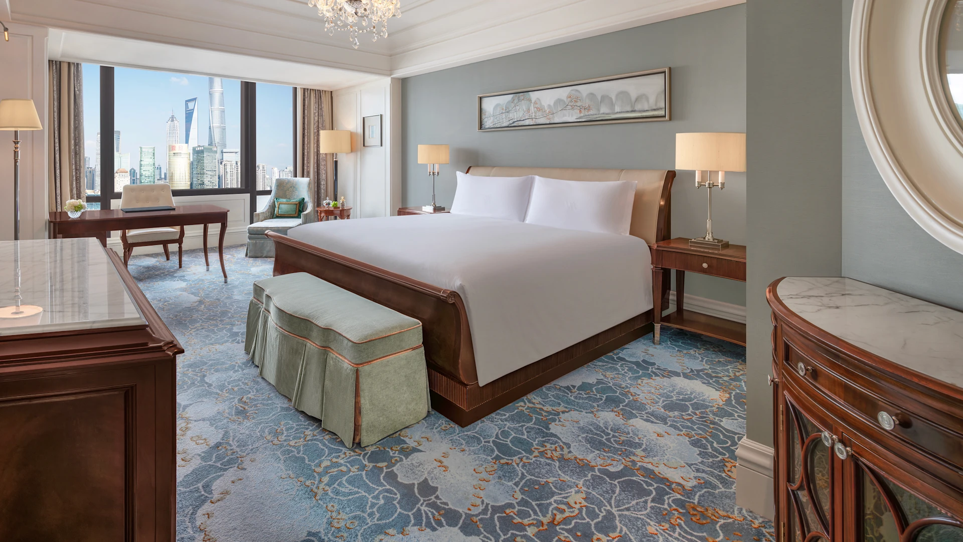 Venues span Weijing Pavilion for acclaimed Cantonese dim sum and Michelin-plate cuisine, Baiwei Garden for continental delicacies, and Pujianghui for Waldorf Red Velvet afternoon tea with Bund vistas. Peacock Alley and the Long Bar serve cocktails, light bites, and live jazz in reconstructed historic settings, with 24-hour room service available.